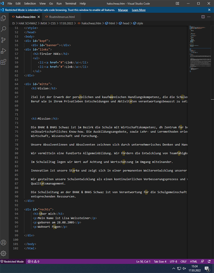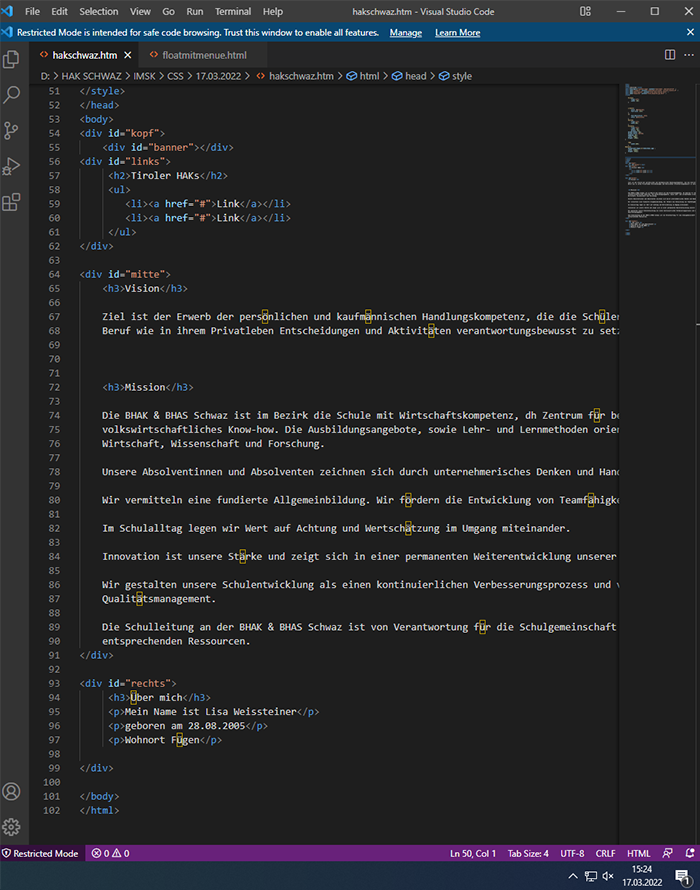 Die Aufgabe bestand darin, verschiedene Maßeinheiten (z. B. cm, pt, px) in HTML und CSS zu verwenden. Ziel war es, eine Webseite mit: