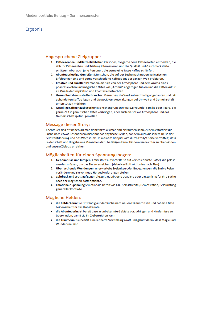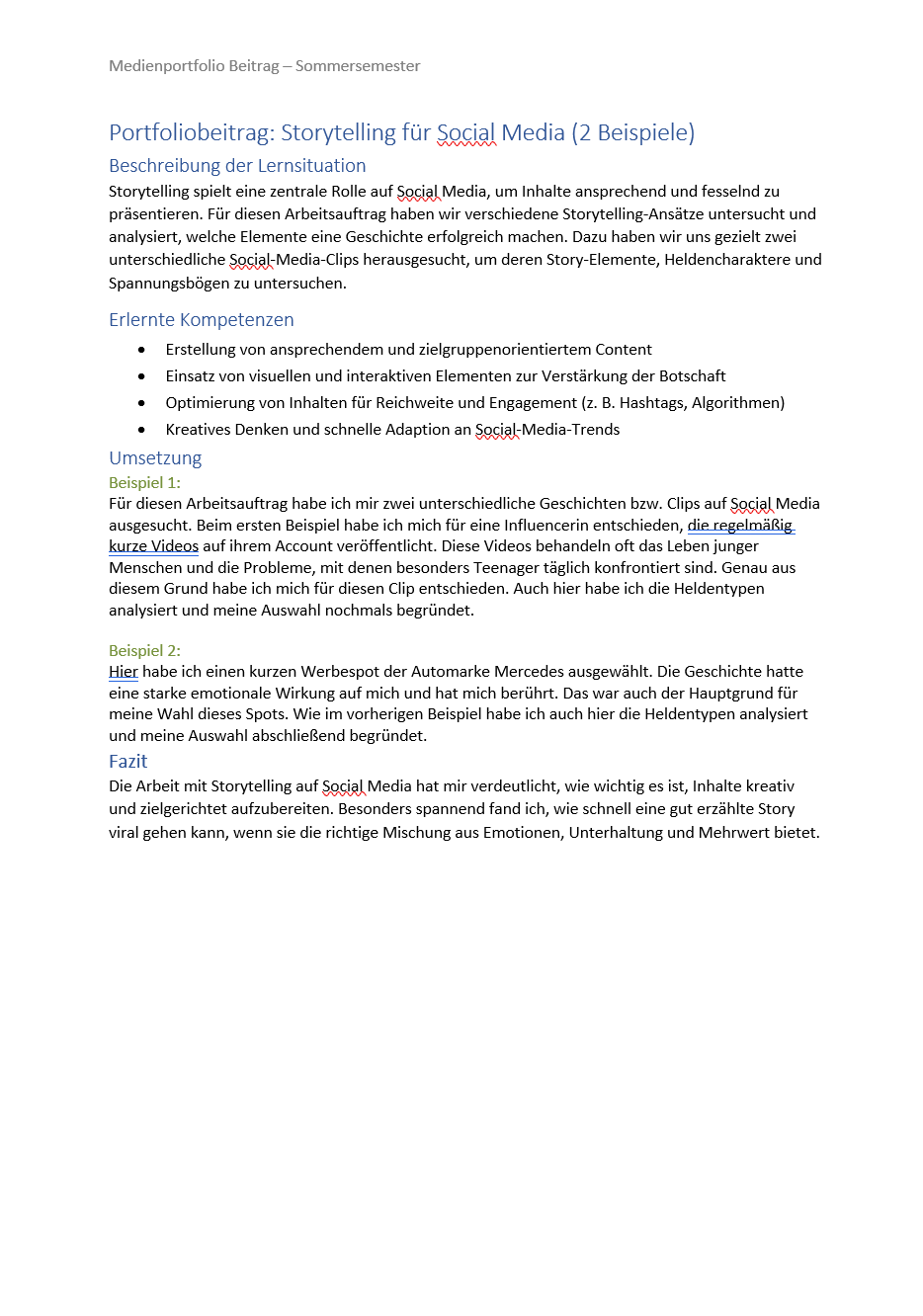 Die Arbeit mit Storytelling hat mir gezeigt, wie wichtig eine gute Geschichte für die Wirkung eines Medienprojekts ist. Besonders spannend fand ich, wie sehr eine strukturierte Erzählweise die Aufmerksamkeit der Zielgruppe steigern kann. Ich habe gelernt, wie Storytelling in verschiedenen Medienformaten eingesetzt wird und welche Elemente eine Geschichte fesselnd machen. Falls ich ein weiteres Projekt mit Storytelling umsetze, würde ich gerne noch stärker auf interaktive Erzählformen setzen, um das Publikum aktiv einzubinden.