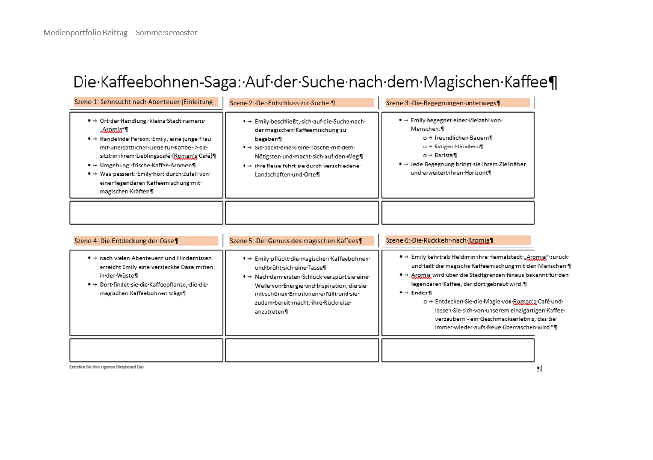 Bei einem Arbeitsauftrag sollten wir ein Leitbild für ein Unternehmen erstellen, dabei war es egal, ob es dieses schon gibt oder nur erfunden wird. Diesbezüglich entschied ich mich für ein Kaffee, besser gesagt für Roman’s Kaffee. Nach langer Überlegung kam mir die Idee -> in meiner Story soll es um eine magische Kaffeebohne gehen, also nannte ich meine Geschichte: Die Kaffeebohnen-Saga: Auf der Suche nach dem Magischen Kaffee.