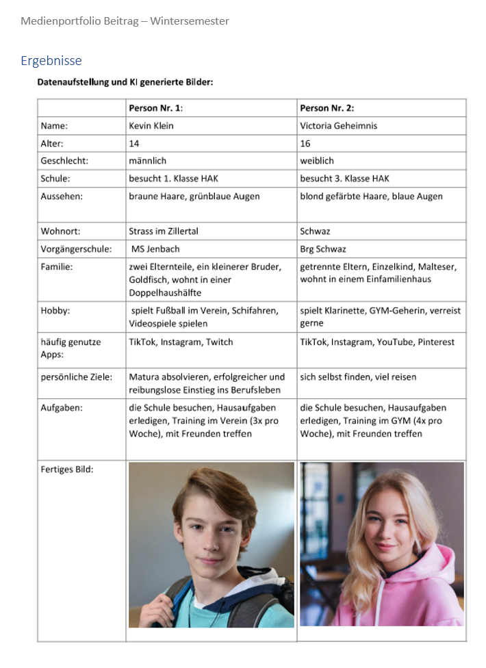Personas helfen dabei, die Zielgruppe zu veranschaulichen. Aus diesem Grund haben wir uns im Podcast-Team überlegt, wen wir mit unseren Beiträgen erreichen und ansprechen wollen. Dabei sind wir zum Entschluss gekommen, dass wir uns hauptsächlich an die Schülerinnen und Schüler unserer Schule wenden wollen. Somit begannen wir mit dem Erfinden von Daten, um eine Persona erstellen zu können. Dabei beachteten wir, dass die Informationen unterschiedlich sein sollten, z. B.: verschiedene Haarfarben, Augenfarben, Familienverhältnisse, Charaktereigenschaften, Hobbys und vieles mehr. Nachdem wir die Zielgruppe genau definierten, nutzten wir eine KI – genauer gesagt Adobe Firefly –, mithilfe derer es uns möglich war, unsere Personas zu verbildlichen.