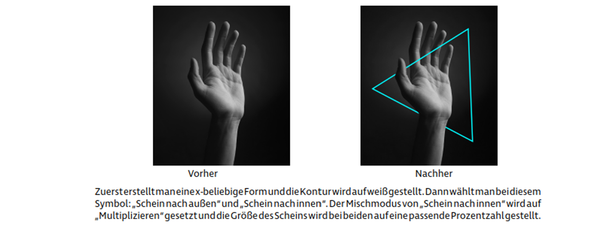 - Mit den Symbolen „Schein nach außen“ und „Schein nach innen“ wurden Lichteffekte erzeugt.