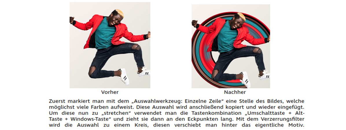 - Mit dem Verzerrungsfilter wurde die Auswahl zu einem Kreis geformt, sodass ein dynamischer Bewegungseffekt entstand.